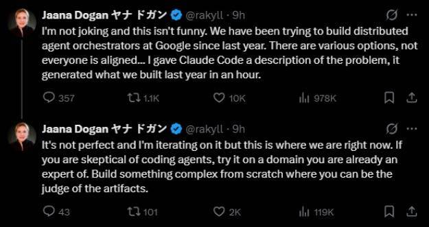 谷歌首席工程师、Gemini API负责东谈主Jaana Dogan公开表示,她只用几句教导词、一个多小时,就借助Claude Code完成了相配于当年一年职责量的效果。