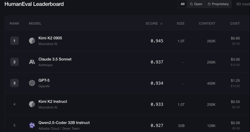 Human Eval排名前五的模子别离来自于Kimi、Anthropic、OpenAI、阿里。