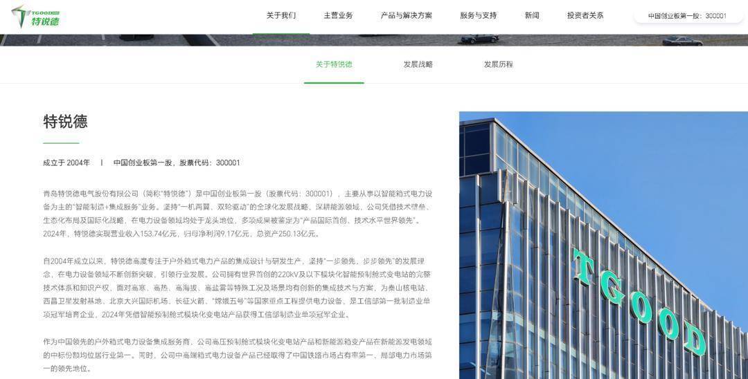 青岛特锐德电气股份有限公司(简称“特锐德”)是中国创业板第一股(股票代码:300001),主要从事以智能箱式电力成立为主的“智能制造+集成工作”业务。坚抓“一机两翼、双轮运行”的大众化发展计谋,深耕动力畛域,公司凭借技艺壁垒、生态化布局及国外化计谋,在电力成立畛域均处于龙头地位,多项遵循被坚决为“居品国外草创、技艺水平全国跨越”。2024年,特锐德兑现贸易收入153.74亿元,归母净利润9.17亿元,总钞票250.13亿元。