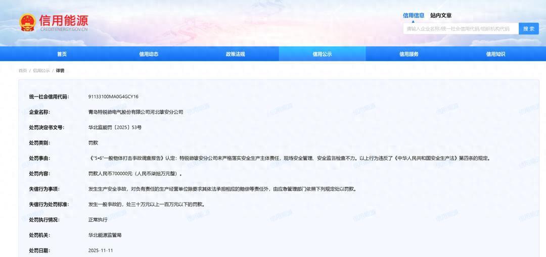 近日,王人鲁晚报·王人鲁壹点记者从信用动力获悉,青岛特锐德电气股份有限公司河北雄老实公司被华北动力监管局罚金东说念主民币700000元。