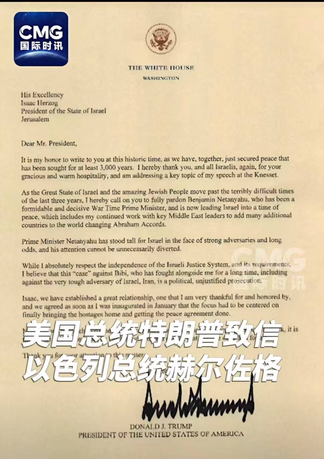 《以色列时报》称,内塔尼亚胡被指控涉嫌纳贿,特朗普近几个月来屡次就此事表态。上个月,特朗普访以在以色列议会发表话语时,号令以色列总统赫尔佐格赦免内塔尼亚胡。