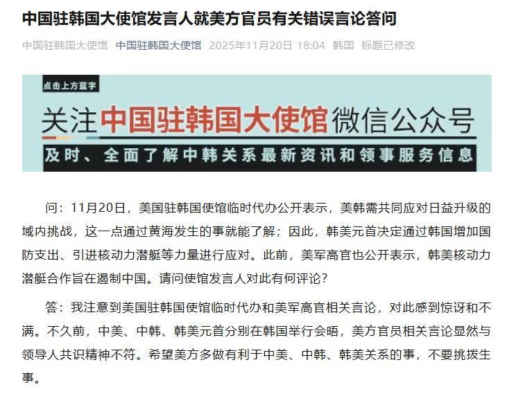问:11月20日,好意思国驻韩国使馆临期间办公开暗意,好意思韩需共同应酬日益升级的域内挑战,这小数通过黄海发生的事就能了解;因此,韩好意思元首决定通过韩国增多国防支拨、引进核能源潜艇等力量进行应酬。此前,好意思军高官也公开暗意,韩好意思核能源潜艇合营旨在败坏中国。请教使馆发言东谈主对此有何指摘?