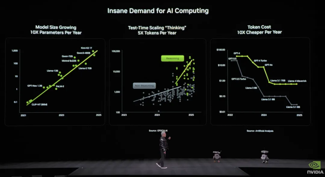 黄仁勋描写了算力需求的大肆,模子鸿沟每年 10 倍增长,o1 之后推理形成「想考经由」,后磨砺引入强化学习,诡计量暴增;test-time scaling 让每次推理 token 量再涨 5 倍;况且每次冲到新前沿,上一代 token 老本会以每年 10 倍速率着落,这反过来证据竞赛极其好坏,